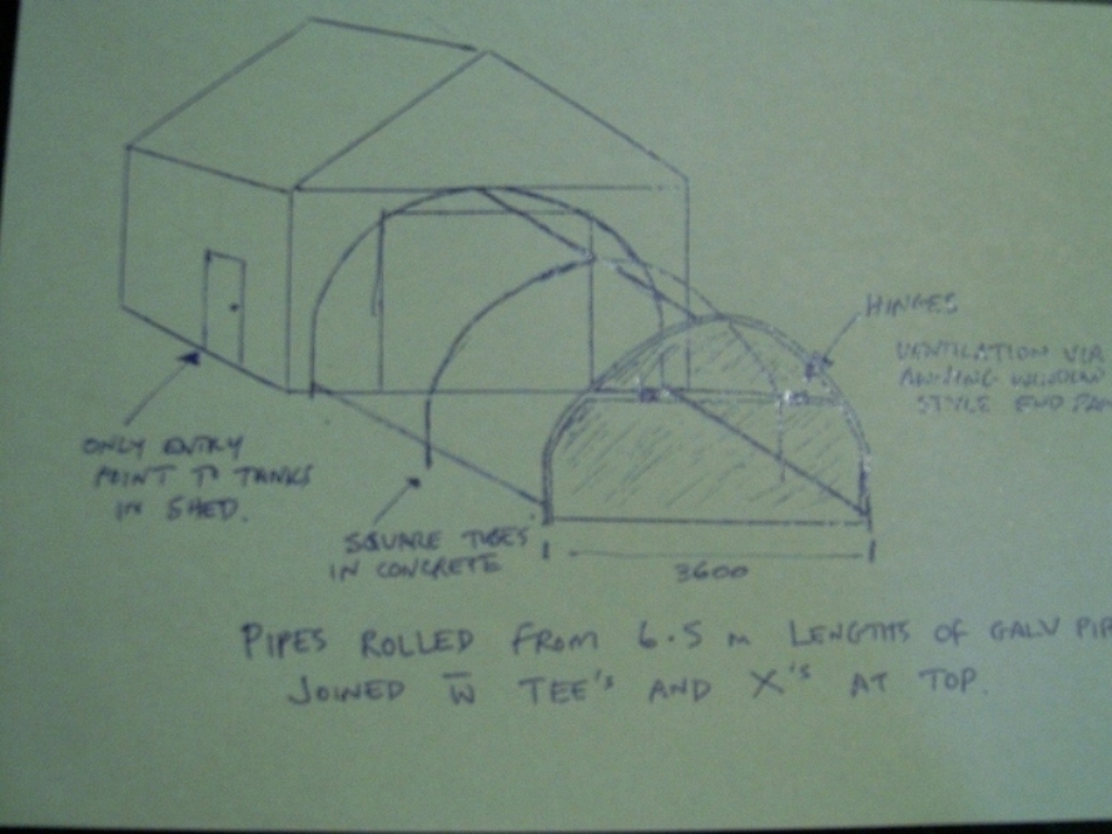 Good one Monya - similar to what I have been thinking of doing, except that the greenhouse will not connect to my roller door - just to a solid wall. Its a shame that the lengths have to be cut after bending, but transporting an arch of that size would be no easy task. I had considerred trying to do the bending myself at home by using a pipe bender - doing very small bends all along the pipe to achieve the overall arch shape. Don't know whether this is realistic or possible - might try it on a smaller scale to see if it is possible. The other thing I want to do is build mine in a way that I can have two skins - therefore having air in between for insualtion purposes. May bend reo bar into arches that sit 10 or so centimeters to the inside of the gal pipe. One lot of plastic would be attached to outside of gal pipe and the other to the reo.