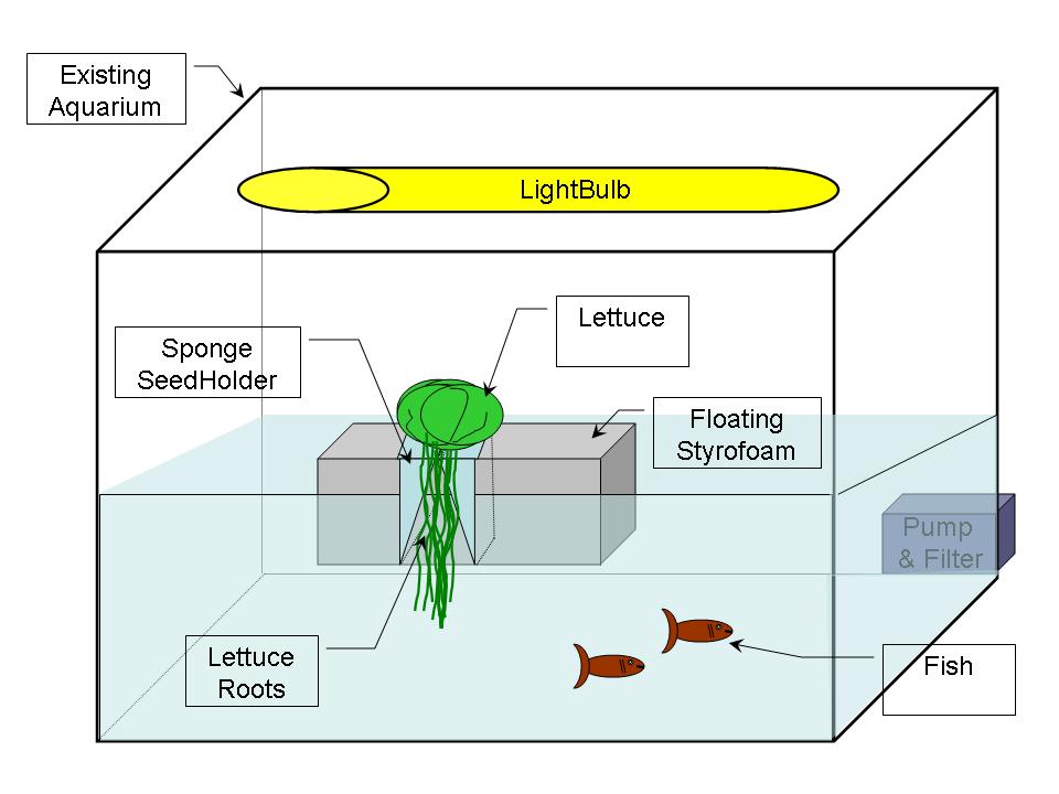 I was wondering how difficult it would be to convert an existing tropical (fresh water) aquarium into a simple aquaponic one by simply adding a styrofoam floating board, holding a small split sponge containing lettuce seeds. The sponge would be split, to allow the roots to grow down into the water. Please see the enclosed diagram for a sketch.