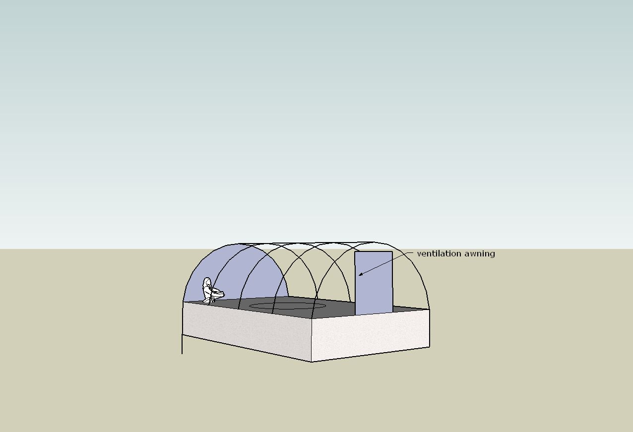 In the end of the greenhouse I will have an awning window style panel that will hinge outwards for ventilation. There will be about 100 mm gap at the bottom of the walls tot he ground to aid circulation. The shed door will be the only entry point. If it gets really stuffy, I will sett up a fan in the shed blowing out towards the awning window. Very rough drawing attached.