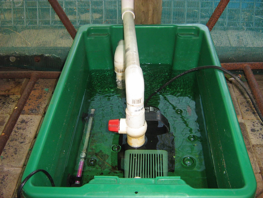 The containers are staggered to obtain gravity feed to and from the growbeds. The pump in the sump tank, pumps the water back up to the fish tanks. The only point of failure is if the water decreases too much in the sump, due to evaporation in the system and the pump will run dry. I have installed a float switch, which I want to link to a 12 v pump to auto top up the sump/fishtanks to compensate for evaporation. I have found it does generally take 4 or 5 days to go from sump full to getting too low for the pump.