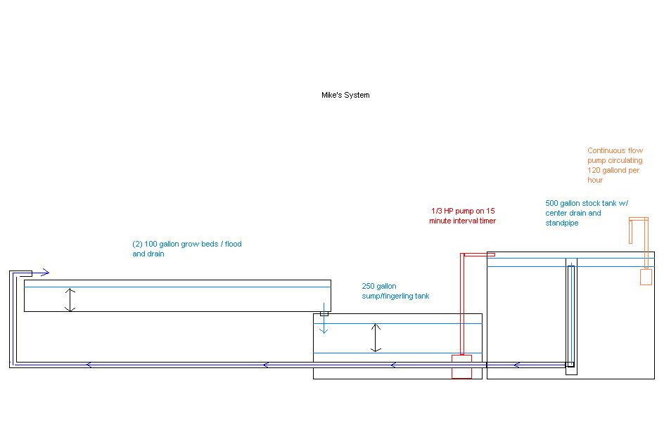 VB, correct and....correct. The standpipe is actually a venturi drain design and sucks from the bottom, but could "stand" improvement. The circulation pump is for aeration and to keep solids flowing toward center drain at the bottom. Yes, majority of grow bed volume is substrate and therefore less water volume than 100 gallons. However, I continue to add growbed space as the system matures. Sump drainage is a major consideration because I am space constrained and not in a floodable space. The entire footprint is 13x24 feet. I will be adding one more grow bed alongside the others this winter, and then vertical from there as time and money permits. Anything verticle will drain directly into the stock tank. The 120 gallon per hour pump is solar driven and therefore aeration will always occur unless power failure occurs at night, or on a dark rainy day.