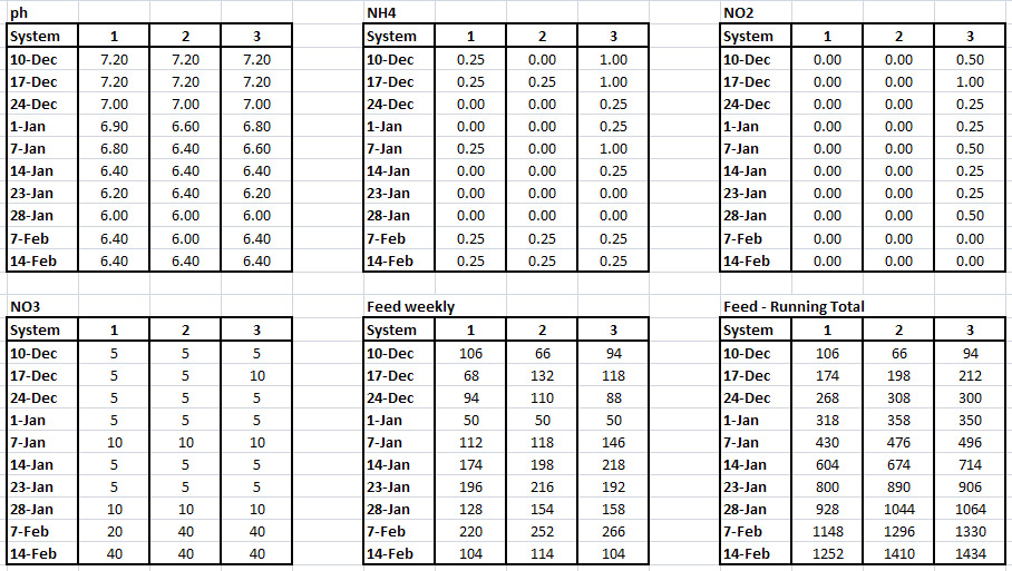 A PH adjustment should fix ammonia which should read zero all the time at this stage of the trial, I also think feed rates should be identical in all 3 systems.